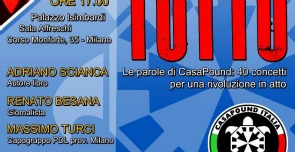 Il primo a lanciare l’allarme lunedì scorso è Roberto Cenati, presidente provinciale dell’associazione partigiani, che in una lettera a Podestà chiede di impedire che si svolga “l’iniziativa organizzata da questo gruppo neofascista, che costituirebbe un’offesa a Milano, città Medaglia d’Oro della Resistenza”. A scatenare la rabbia dell’Anpi, un volantino diffuso da Casapound in cui si pubblicizza l’incontro in Provincia come un evento per presentare il libro di Adriano Scianca “Riprendersi tutto. Le parole di Casapound: 40 concetti per una rivoluzione in atto”. Con postfazione di Gianluca Iannone, fondatore e presidente dell’associazione di estrema destra.
