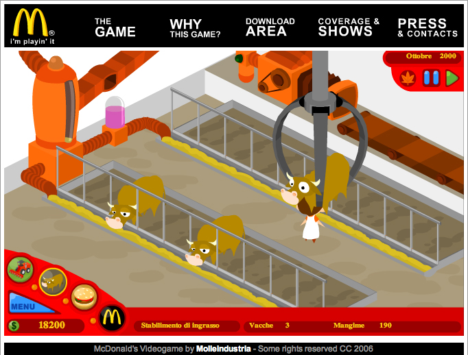 Insomma, fai del male al mondo per accrescere il tuo punteggio. Alfiere di questo mediattivismo, che unisce intrattenimento e contestazione, è il sito molleindustria.org. Presentato come un collettivo di game designers, in realtà è un one-man-show di creatività e satira sociale e politica. Tutta da giocare. Se l’è inventato Paolo Pedercini, italiano emigrato negli Usa. Il sottotitolo di Molleindustria, radical games against the dictatorship of entertainment, è tutto un programma. Prendete il McDonald’s Game. Come tutti i giochi di Molleindustria, per giocarlo basta scaricare gratuitamente l’applicazione in flash. Una volta lanciata, il vostro compito è accrescere i profitti della multinazionale più odiata del mondo. Nelle varie schermate di gioco – pascolo, macellazione, negozio e ufficio marketing – potete abbattere villaggi e convertirli a pascoli, iniettare ormoni della crescita nelle vacche, cibarle con farine animali, corrompere dietologi, climatologi, ispettori sanitari e politici, fare mobbing ai vostri dipendenti, avviare campagne diffamatorie contro i detrattori del marchio. Non fatevi scrupoli o il minaccioso pagliaccio di McDonald’s vi licenzierà con vergogna.