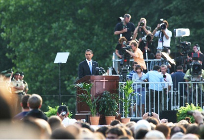 Con la sua invenzione in spalla, Julius si sbizzarrisce. Prima di essere eletto, Obama tiene il celebre discorso pubblico a Berlino. Julius proietta col suo Folgoratore una croce (la vedete nella foto) sul leggio del futuro presidente “per sottolineare l’artificiosità di quella scena”, spiega, “un evento costruito ad arte per conferire a Obama un che di messianico”. Parte per la Cina e durante le Olimpiadi di Pechino folgora con una colomba bianca il volto di Mao. I tanti turisti presenti al mausoleo cliccano a ripetizione il tasto play delle loro macchinette fotografiche, senza capire che diavolo sta succedendo e perché una colomba si è magicamente disegnata sul viso del Grande Capo. Il Fulgurator non risparmia neanche il sindaco di Berlino, Klaus Wowereit, folgorato sulla giacca col simbolo della compagnia O2, “smaccatamente favorita” dal primo cittadino nella costruzione della nuova sede aziendale, costata le penne (e i mattoni) a un isolato che per decenni aveva ospitato locali notturni e di ritrovo per artisti. Scempio imperdonabile per Julius, cresciuto a Kreuzberg, uno dei quartieri più politicizzati di Berlino.