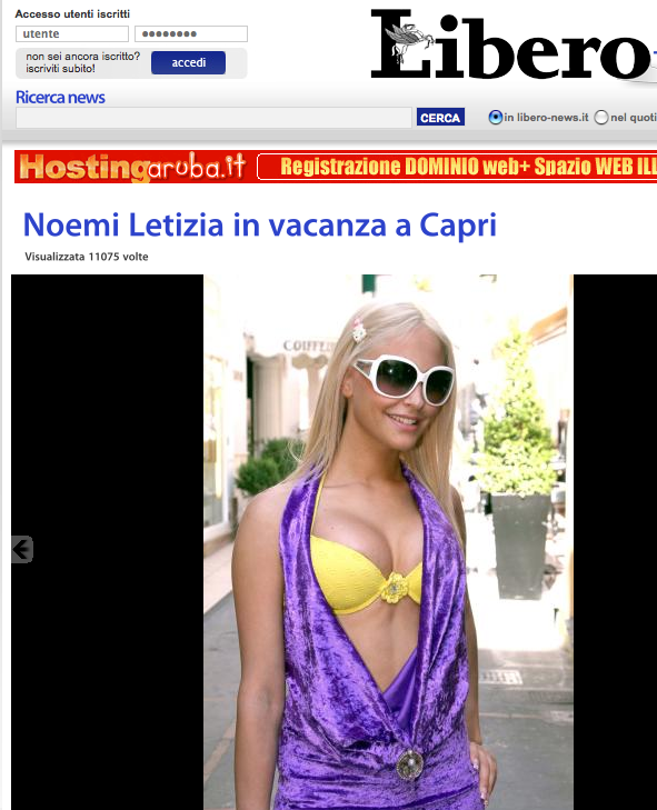 Libero ci regala alcuni scatti della vacanza a Capri della 19enne Noemi Letizia. “Sono ancora illibata” ci teneva a far sapere lo scorso anno la papi-girl di Casoria. A una anno di distanza, invece, si mostra, come dire, più comunicativa e… spigliata. Cosa fa la maturità!