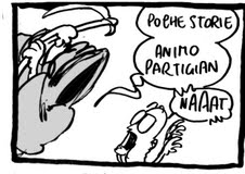 Un uomo come lui non può essere morto in un modo qualunque, lo sappiamo tutti. Sicuramente ci sarà stato qualcuno ad armare la mano della grande livellatrice, di certo qualche trama di palazzo, ovviamente qualche oscuro complotto, cose così. Per indagare su questo inquietante attentato alla Repubblica, i partigiani Nap e Nat (chi non li conoscesse potrà ritrovarli nel primo episodio – in questo blog – a titolo ‘La resistenza continua‘) tornano in campo con un episodio speciale disegnato ad hoc dal titolo ‘Compagna Morte‘: in un’Italia di inizio millennio e fine regime i compagni inseparabili e incorruttibili affrontano e risolvono uno dei più complicati problemi che da sempre affligge l’uomo: cos’è la morte? c’è vita dopo la morte? Berlusconi ci sarà anche in quella vita?