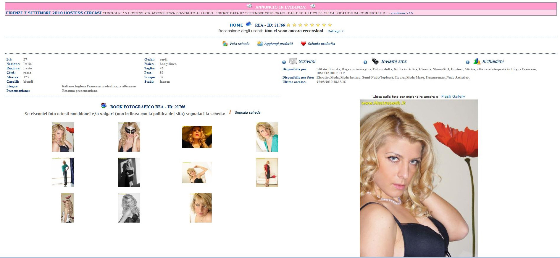 Anche perché Rea non è una qualunque: è una delle tre hostess che si sarebbero convertite all’Islam dopo gli incontri con Gheddafi. Il suo ciuffo biondo e i grandi occhi verdi che spuntavano sotto un vistoso chador nero non erano passati inosservati all’uscita dall’ambasciata di via Caldonazzo sabato scorso. Della sua presunta conversione, Rea ha parlato al Corriere della sera, presentandosi col nome di Rea Beka, 27 anni, albanese che vive in Italia da dodici. Lo ha fatto contravvenendo al primo comandamento imposto dall’agenzia Hostessweb che l’aveva reclutata insieme ad altre 500 per l’ora di religione col Colonnello: non parlare con nessuno, specie coi giornalisti. Pena, l’espulsione dal giro. Eppure, fino a questa mattina la sua scheda continuava a essere visibile nel catalogo on-demand dell’agenzia (clicca qui per visualizzare la scheda, rimossa dopo la pubblicazione di questo articolo), completa di foto che farebbero gridare al sacrilegio il più moderato dei seguaci di Maometto. Nessun provvedimento, cioè, è stato preso nei suoi confronti da Londero.
