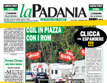 Cgil in piazza con i rom” il lancio in prima pagina ieri primo settembre. “Quelli della Cgil – l’attacco dell’articolo su La Padania – sono proprio dei rifugiati politici. Ovvero si aggrappano a ogni causa persa nella disperata caccia a una tessera che non c’è”. La colpa del più grande sindacato italiano, secondo Paola Pellai, sarebbe quella di non pensare al lavoro “per difendere Rom e Sinti”. Ad accompagnare il tutto, c’è una foto enorme, che prende oltre metà del layout della pagina. Si vede un accampamento Rom (ma potrebbe anche essere un campeggio visto le roulotte nuove di zecca e le auto di lusso) sul quale sventolano le bandiere della Cgil.