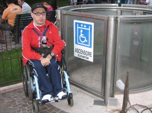 Ho avuto il piacere di recarmi a Verona il 12 settembre 2010 per assistere al bellissimo concerto di Fiorella Mannoia che si è svolto in Arena. In attesa dell’inizio del concerto dopo aver fatto uno spuntino nella splendida piazza Brà con dei tramezzini preparati da mia moglie Annalisa Nesi, prima di entrare in Arena e prendere posto, ho sentito la necessità di espletare alcuni bisogni fisiologici e così come ogni volta quando usciamo con mia moglie abbiamo dovuto iniziare la “caccia al bagno accessibile” visto che ho un handicap motorio e per spostarmi uso la sedia a rotelle . Passeggiando per Piazza Brà alla ricerca del bagno abbiamo notato un cartello con scritto “wc”, dentro di me ho pensato: ci siamo. Ma l’entusiasmo è svanito rapidamente perché per poter raggiungere i servizi bisognava scendere attraverso una scala ripida e priva di monta scale perciò per me impraticabile.