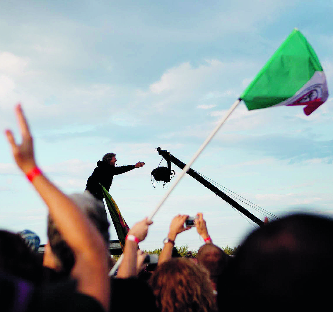 Entra lui e la musica si ferma. Il padre di questa manifestazione, Beppe Grillo, accolto da un urlo festoso: ”Guardatevi un attimo, non siamo più quelli di 40 anni fa, in un posto così si facevano delle canne, facevano l’amore nelle tende e si rotolavano nel fango ed io ho pregato questo clima: piove, non piove ci gira attorno, per crearci quell’ansia… lì dietro c’è il fango prima di andare via vi invito a prenderne un po’ perché questo è il fango più pulito che c’è in Italia”. Gli applausi si mescolano alle parole: ”Sei grande… siamo con te… tu sei con noi grazie!“. “E siamo solo all’inizio stanno arrivando, c’è l’autostrada intasata andremo avanti… e lo spettacolo lo farete voi devono rendersi conto di chi siamo. L’ultima che ci hanno detto è che siamo squadristi, sì! Della la raccolta differenziata però, quelli che prendono una cicca e la mettono nella borsa contenitore… andiamo avanti!”. E avanti si va con la musica. Almeno per ora.