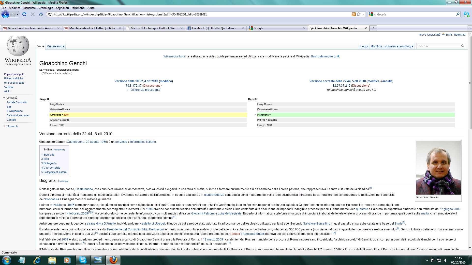 Fino a ieri la pagina di Wikipedia dedicata a Gioacchino Genchi, ex consulente tecnico dell’autorità giudiziaria, riportava, oltre che la sua biografia, anche la sua data di morte. Ma dopo la segnalazione del nostro sito, qualche utente è andato a correggerla. (Guarda l’immagine con le differenze) Come è noto l’enciclopedia universale online, scritta e aggiornata dal popolo di Internet, a volte non c’azzecca. Per fortuna Genchi non solo è vivo ma gode anche di ottima salute e di un solido sense of humor. Tanto che oggi, nel suo blog sul nostro sito, scriverà un post “redivivo”.