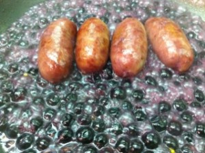 Qualsiasi uva da vino Nera tipo San Giovese o Cannaiolo, con salsicce di maiale ben allevato. Rosolarle rapidamente in un padella o in una teglia da forno con grill potente per poi farle risaltare nella loro sugagna con la Nera. La salsina che ne risulterà sarà fasciante per le suddette salsicce che nell’accompagnarvi con pezzi di pane casalingo mangerete insieme. Frantumate col morso qualche rinfrescate caldo-umido integro chicco. Non scartate i semi che mi dicono facciano tanto bene, se non altro ai miei sensi di colpa scatenati dal non sapermi fermare quando mi faccio questo piatto elegantemente contadino, mangiando ennesima salsiccia con filone di pane.