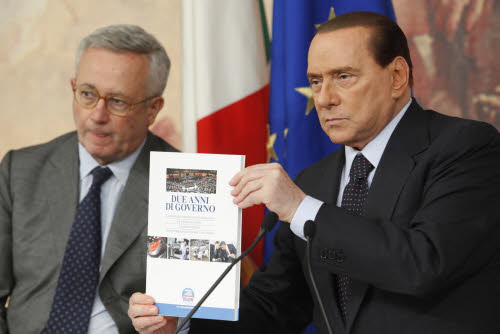 Ostenta sicurezza ma anticipa toni da campagna elettorale. Garantisce la durata della legislatura ma presenta i risultati dell’esecutivo in un libro, “Due anni di governo”, che rimanda ai tempi del fotoromanzo “Una storia italiana”. Stretto tra incudine e martello Berlusconi oggi pomeriggio ha convocato – a sorpresa – una conferenza stampa per anticipare le prossime mosse dell’esecutivo. Dopo il discorso alla Camera, la burrascosa replica al Senato e l’ancor più agitato comizio al Castello Sforzesco della scorsa settimana, il Cavaliere di oggi si presenta nella doppia veste di presidente del Consiglio e capo del Pdl, l’uno intento a mantenere insieme il governo e a placare la Lega, l’altro pronto a mostrare i numeri da campagna elettorale.