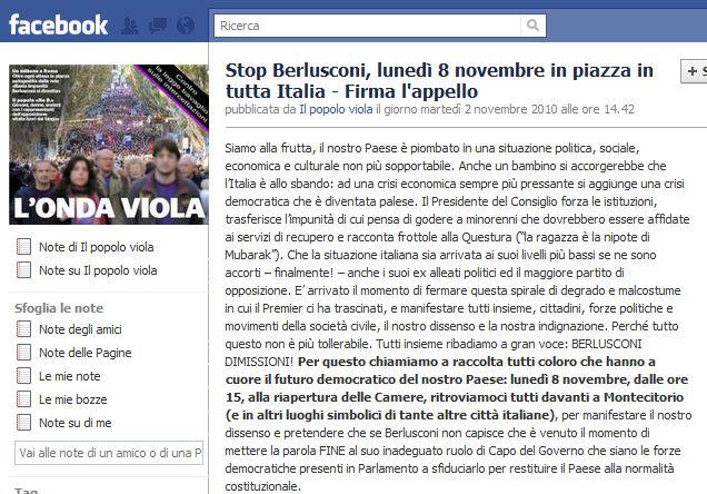 “Berlusconi dimissioni”: lo stesso slogan dei due No B. Day, torna lunedì prossimo 8 novembre, a Roma davanti al Parlamento e in tutte le piazze d’Italia. Il popolo viola lancia infatti un appello e una manifestazione nazionale per chiedere le dimissioni di Berlusconi: “Anche un bambino – scrivono sulla pagina nazionale – si accorgerebbe che l’Italia è allo sbando: ad una crisi economica sempre più pressante si aggiunge una crisi democratica che è diventata palese. Il Presidente del Consiglio forza le istituzioni, trasferisce l’impunità di cui pensa di godere a minorenni che dovrebbero essere affidate ai servizi di recupero e racconta frottole alla Questura”.