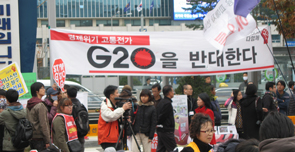 La polizia non ha voluto lasciare nulla al caso nemmeno alla manifestazione tenutasi oggi, a poche ore dall’inizio del vertice. Dopo gli scontri registratisi domenica scorsa durante la prima marcia dei sindacati, si è preferito tenere la società civile a molti chilometri di distanza dal centro congressi dove si incontrano i grandi della Terra. Le paranoie degli addetti alla sicurezza – presenti in un rapporto quasi paritario rispetto ai soli 5mila attivisti accorsi all’appuntamento presso la stazione centrale di Seoul – erano tali e tante che hanno iniziato ad avvicinare i giornalisti, già muniti del vistoso accredito per il G20, fornendogli una fascia per il braccio arancione con scritta “press” in bella evidenza.