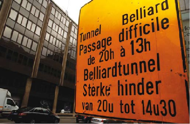 Il pannello stradale annuncia difficoltà di passaggio in uno dei tunnel più trafficati del quartiere europeo. Solo che in francese le difficoltà terminano alle 13, in olandese (fiammingo) alle 14:30…