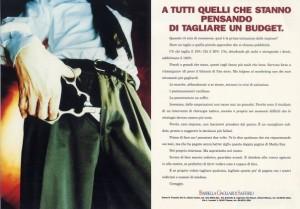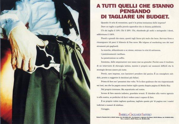 Se potessi, sbatterei sul tavolo del ministro Tremonti la magnifica campagna che risale al 1993 (foto in testa) quando iniziò una crisi da cui non ci siamo più rialzati. I primi ad essere tagliati furono proprio gli investimenti pubblicitari da parte delle aziende. La campagna la fece, a nome di tutto il comparto di settore, il mio amico Pasquale Barbella, uno dei grandi maestri nella nostra professione. Sono certo che sarebbe ancora più valida oggi per la nobile causa di incentivare gli investimenti nella ricerca, e di sicuro verrebbe ancora premiata.