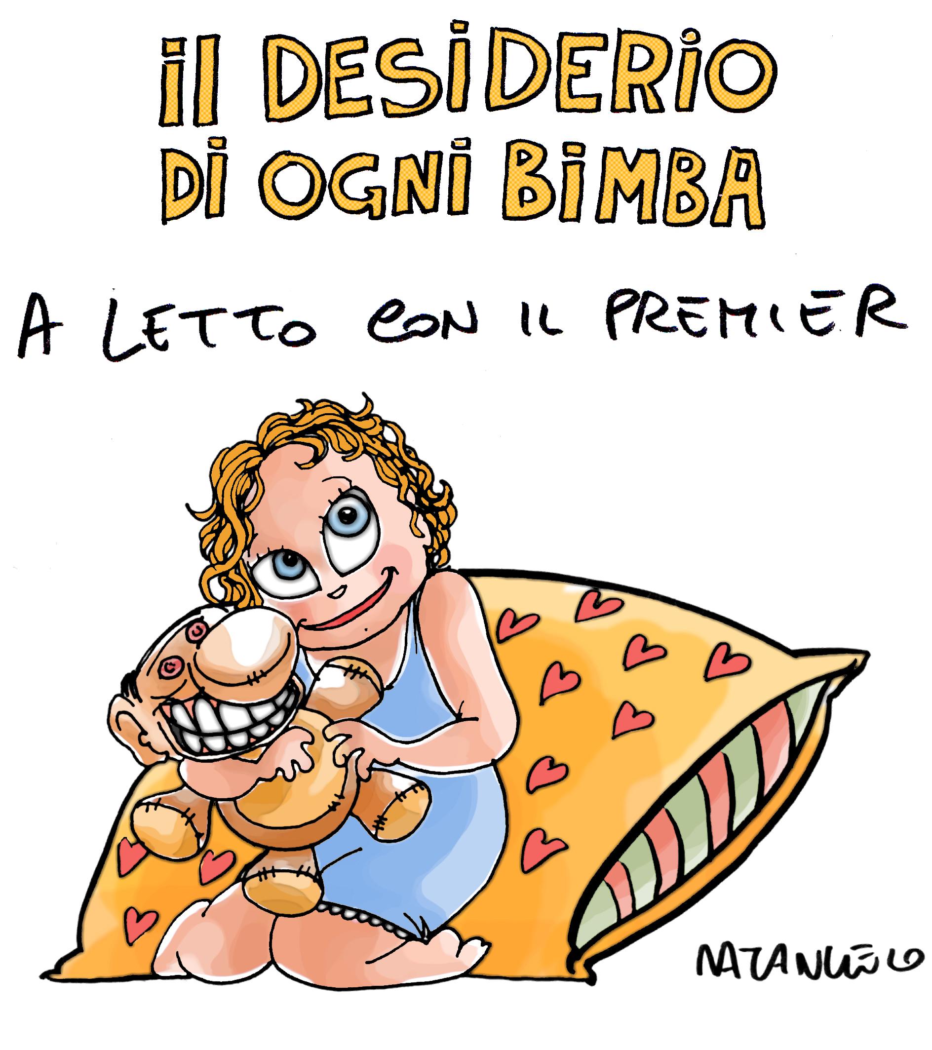 20, 30, 40, 50 ragazze. Tutte a dormire dal premier e col premier. Ma si tratta di serate innocenti, distensive, niente di scandaloso. Si parla – si mormora – anche di una, due, tre minorenni. Anche loro ad Arcore, ma il premier non le ha mai toccate, manco con un dito. Le metteva a letto, gli leggeva le favole. Le ha aiutate economicamente. E noi lì a pensar male. Lui le ha prese a cuore, le sue bimbe, anche fossero minorenni. Le sfamava. Se ne riempiva la tavola per le sue sontuose cene invitandole come ospiti e non, come invece fanno gli odiosi comunisti (ipse dixit, Napoli 2006), come pietanze.