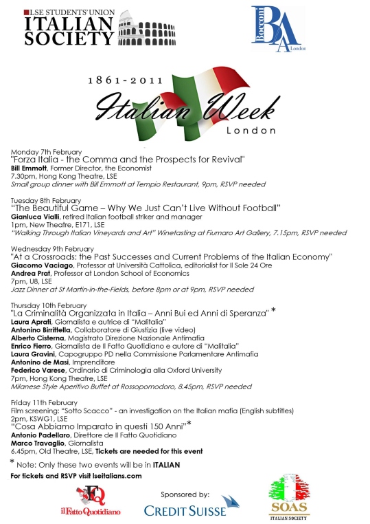 Culminerà venerdì con un intervento del direttore del Fatto Quotidiano Antonio Padellaro e del vicedirettore Marco Travaglio, l’Italian Week organizzata presso la London School of Economics (Lse) per iniziativa degli studenti dell’Italian Society. Lo scopo è quello di celebrare i 150 anni dell’unità d’Italia senza retorica e falsi compiacimenti.