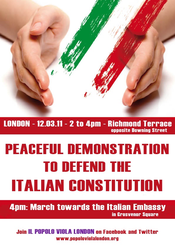 L’appuntamento, organizzato ancora una volta dal Popolo Viola London, costantemente impegnato in azioni di sensibilizzazione e protesta pacifica, è previsto per sabato 12 marzo alle ore 14, a Richmond Terrace (davanti a Downing Street). Il corteo seguirà poi lo stesso percorso della manifestazione “Se non ora quando?”, tenutasi lo scorso febbraio contro il governo Berlusconi. Ancora più dinamica della volta precedente, invece, sarà la sequenza degli interventi durante il discorso di apertura, supportato da un’accattivante scenografia. L’iniziativa, pubblicizzata attraverso una mirata attività di volantinaggio in tutta la capitale britannica, si avvale di un efficace manifesto avente come logo due mani, “quelle di ogni cittadino italiano” che sorreggono e proteggono il tricolore  da eventuali attacchi esterni.