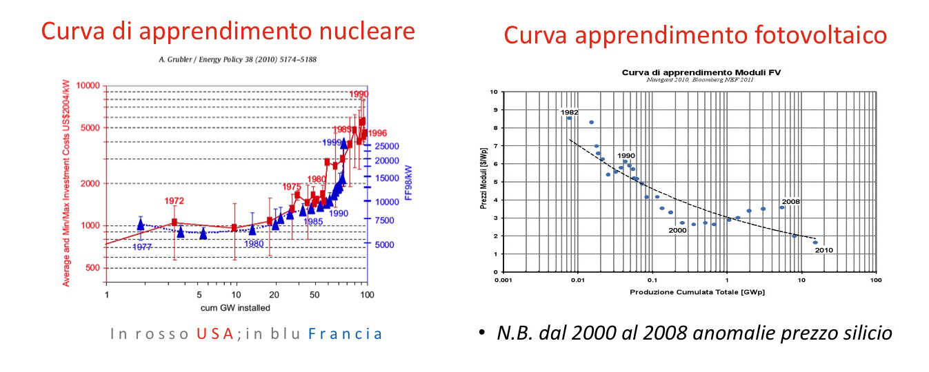 L’avventura del nucleare si scontra così con l’insostenibilità dei costi e con la progressiva maggiore convenienza delle altre fonti, in particolare quelle rinnovabili. Riporto qui un’analisi convincente delle “curve di apprendimento” del nucleare statunitense e francese e del fotovoltaico (l’energia oggi più cara). Si definiscono economie di apprendimento quelle che consentono, coll’affermarsi di una tecnologia e all’aumentare del volume di produzione cumulato di un prodotto, di osservare una riduzione dei costi medi unitari. Si presume che le competenze accumulate dalle imprese durante la loro permanenza sul mercato permettano un miglioramento continuo dei processi di produzione, dell’allocazione delle risorse e via dicendo. Generalmente, con l’affermarsi di una tecnologia, scendono i costi. È così per i microchip, per le automobili, per l’industria del vetro, per le centrali a gas, per l’energia eolica e per il fotovoltaico.