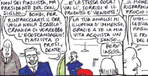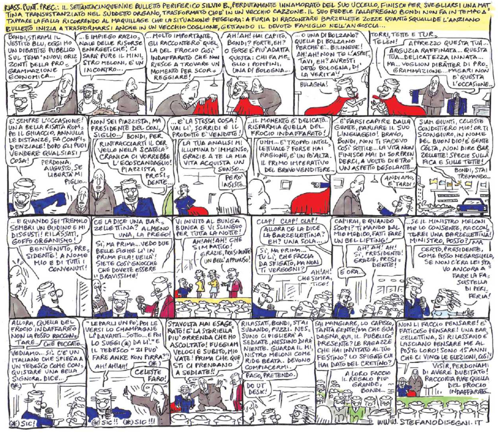 Questa volta il “natural bon slave” Sandro Bondi è alle prese con l’irrefrenabile voglia di Berlusconi di raccontare barzellette sconce. Tant’è che dopo essersi trasformato in un pene, a causa della sua vocazione per le storielline zozze, al presidente del Consiglio comincia a crescere un’enorme testicolo dietro la schiena. Una nuova grana per il povero Bondi …
