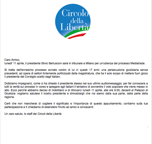Dobbiamo impegnarci, come ci ha chiesto il presidente stesso nel suo ultimo audiomessaggio, per far conoscere a tutti la verità sui processi in corso e spiegare agli italiani il tentativo di sovvertire il voto popolare che viene messo in atto. Ecco perché abbiamo deciso di mobilitarci e di ritrovarci lunedì 11 aprile, alle ore 9.00, davanti al Palazzo di Giustizia: vogliamo salutare il nostro presidente e dimostrargli che noi siamo dalla sua parte, dalla parte della ragione.
