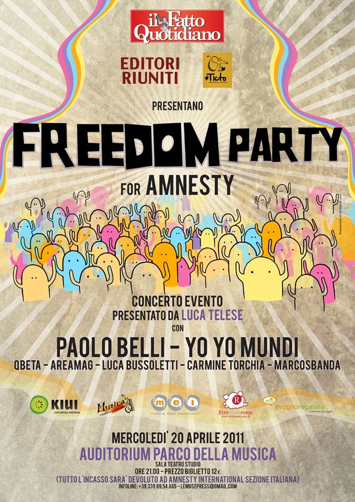 Freedom Party for Amnesty è un modo per raccogliere le energie creative e le idee su quello che sta accadendo a pochi chilometri da noi. L’onda inarrestabile di libertà che sta investendo quei paesi deve essere amplificata dalla musica che, da sempre, sa comunicare le emozioni alla gente comune. Con il supporto de Il Fatto Quotidiano, e la direzione artistica di Paolo Cobianchi, insieme all’Associazione Culturale Ticto, Editori Riuniti e Mei d’autore, alla web agency Kiui, al sito di wish-lists Tivoglioregalare.it, a MusicaControcorrente e a ErrecomeRoma si esibiranno:
