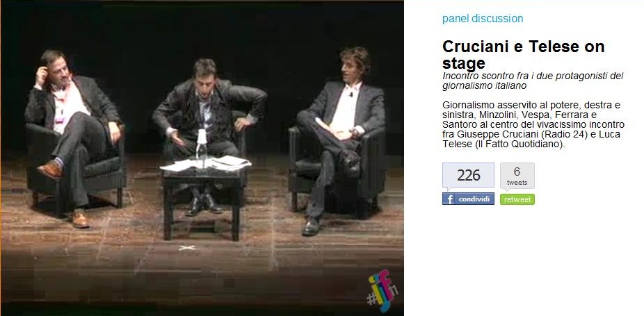 luca telese e giuseppe crucianiLuca Telese, cioè io, contro Giuseppe Cruciani, sul palco del Festival del giornalismo, duellando sul tema: giornalismo di destra, giornalismo di sinistra. Ho letto che alcuni commenti, in rete, dicono: avete discusso troppo di politica. E’ possibile. Ma è una conseguenza della prima legge di Tetris. Lo spettacolo si è mangiato l’informazione, l’informazione si è mangiata la politica, e il Bunga Bunga, se possibile, si è mangiato tutto quello che restava. Lo dico perché, a costo di scontentare i puristi, non si può fare questo dibattito senza citare Berlusconi. E senza parlare del potere, oggi in Italia, di quello politico e di quello economico, e di come pesano sulle nostre teste. Ho un ricordo bello e un po’ delirante di questa giornata, e anche una percezione paradossale del rapporto che ho con Cruciani. Siamo amici, ci stimiamo, ma la vediamo in modo assolutamente diverso. Siamo andati a pranzo con la nostra famiglia allargata (la banda di Current con in testa le sue fantastiche amazzoni e il director Tessarolo), e già a fine pasto siamo precipitati nei prodromi della sfida. Sfottevo Cruciani dicendo che aveva messo la redazione a lavorare. Io scherzavo, ma intanto aveva un fascicolo in mano, che brandiva con ironica minaccia.