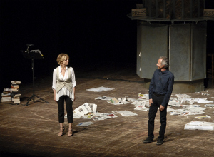 Su libertà, giornalismo, ribellione ad ogni tentativo di guinzaglio da parte dell’editore-padrone al quale nel 1994 sbattè la porta, lasciando il suo Giornale e fondandone uno nuovo, La Voce. Una scenografia ridotta all’osso, fatta di un’edicola un po’ retrò, a metà tra la Rive Gauche parigina e un’Italia post boom economico, una panchina di legno, poche note di violino, suoni distorti, diluiti, rumori di carta strappata, rimbombi ossessivi: questo il fondale che ospita il passaggio di testimone da un protagonista all’altro del palco.