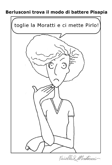 La campagna di terrorismo nei confronti di Pisapia assume sempre più una connotazione grottesca: zingari che costruiscono baracche nei nostri giardini arredandoli con mobili Ikea, moschee costruite al posto dei centri commerciali (e chi la trova più la lonza di maiale) vigilesse in gonnellone a fiori al posto della divisa e vigili di quartiere col cilum al posto della paletta, parrucchieri gay che si rifiutano di pettinare la Moratti e si sposano davanti al sindaco, minando l’idea della famiglia tradizionale che B. rappresenta come icona vivente.