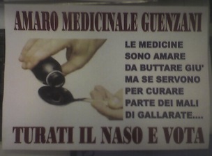Dopo la debacle di Milano, la Lega misura quanto potrebbe fruttare in termini di voti la rottura con il Pdl. E lo fa sul campo del ballottaggio di domenica prossima. Il caso emblematico è quello di Gallarate, dove il Carroccio ha invitato i suoi elettori a votare il candidato del Pd Edoardo Guenzani piuttosto che sostenere il Popolo della Libertà. “Amaro medicinale Guenzani. Turati il naso e vota”, si legge sui manifesti elettorali. Ma gli accordi fra Lega e Pdl sono saltati un po’ ovunque.