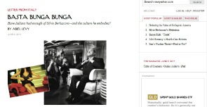 NEW YORK – “Basta Bunga Bunga”. Con questo titolo, il prestigioso settimanale The New Yorker prende atto (o forse auspica) la fine del Cavaliere. Il sommario si chiede: “Gli italiani ne hanno abbastanza di Silvio Berlusconi e del suo edonismo?”. Autrice dell’articolo, pubblicato ieri e disponibile online è Ariel Levy, una redattrice del New Yorker che ha passato anni a studiare “cultura dell’apparenza” e “oggettivazione del corpo femminile”, negli Stati Uniti ed altrove.