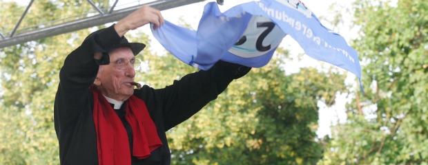 Seimila persone sotto la pioggia. Cantano Bella ciao diretti da un maestro particolare, “un’ira d’iddio”, come dice il direttore del Fatto Quotidiano Antonio Padellaro: don Andrea Gallo. Un fiume in piena. Parla canta, si infiamma. E’ don Gallo, insomma.