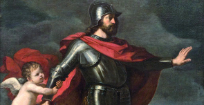 Ho poi optato per la presente replica, anche perché la rassegna è stato l’ultimo omaggio a Sir Denis Mahon, spentosi il giorno di Pasqua, a Londra, che del Guercino è stato il massimo conoscitore. Le sale più in alto della “Mole Adriana” accolgono un solo, grande dipinto di questo artista: il Marte furibondo trattenuto da un Amorino che, dipinto per il barone Mario Mattei di Paganica, non fu mai consegnato, in quanto sostituito dal Guercino con una versione orizzontale, oggi nel Cincinnati Art Museum. Il compianto Sir Denis, quando Federica Gasparrini gli sottopose il ritrovamento, ebbe a confessare che, noto per i disegni preparatori e le copie incise e dipinte, l’aveva cercato per quarant’anni ed era felice del fatto che venisse finalmente esposto a Roma, dove non era mai giunto. L’dea di esibirlo a Castel Sant’Angelo era stata suggerita dalla presenza, sullo sfondo della grande tela, di una fortezza ideale che rammentava a struttura della “Mole Adriana”. Il dipinto, oltre che da quanto ricordato, era noto in particolare per la testimonianza lasciata da Carlo Cesare Malvasia, biografo del Guercino, il quale l’aveva visto, nel 1666, tra le opere invendute rimaste nella bottega bolognese del pittore.