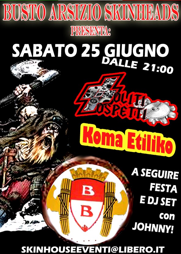 Succede a Busto Arsizio, in provincia di Varese, dove un gruppo vicino all’estrema destra (Skinhouse Milano) ha diffuso nei giorni scorsi un volantino che annuncia un evento per questa sera, la “Busto Arsizio skinheads fest!” (pubblicizzato anche tramite Facebook). In città è comparso un volantino nero che strizza l’occhio ad una certa retorica, con accenni gotici e toni cupi, su cui si leggono i nomi dei gruppi musicali invitati a suonare, i Soliti sospetti e i Koma etiliko. A suscitare l’indignazione degli antifascisti della città non è l’evento in sé, ma il significato simbolico con cui gli organizzatori hanno voluto caricarlo. In un grosso tondo nella parte bassa del volantino è infatti stampata un’elaborazione grafica dello stemma della città di Busto Arsizio, affiancato per l’occasione da due fasci littori. È chiaro che non è più solo una festa per quattro nostalgici, ma diventa qualcosa di più profondo.