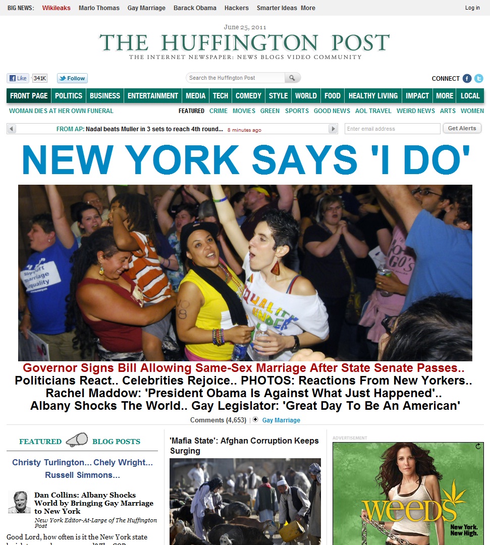 Nell’immagine, l’home page dell’Huffington Post con il titolo New York dice ‘Lo voglio’.