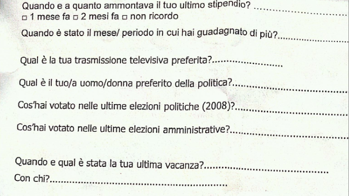 La prima denuncia era arrivata da alcune giovani studentesse già l’anno scorso. Una denuncia ripescata oggi dell’associazione Insurgent city, che nel pomeriggio ha distribuito alla folla che stava protestando contro il Comune il questionario che la Sws sottoponeva a chi si presentava per un colloquio di lavoro. Un questionario su cui appaiono domande quanto mai fuori luogo: “Quale quotidiano leggi abitualmente? Quando sei stato l’ultima volta al cinema? Quando hai acquistato l’ultimo cd? Quando hai scaricato l’ultima canzone da internet? Qual è il tuo sito internet preferito? Qual è il tuo film, libro, cd preferito? Quando sei stato l’ultima volta ad un concerto? Quando hai comprato l’ultimo vestito? Quando hai comprato l’ultimo paio di scarpe? In che negozio? Di che marca?”. E ancora, entrando sempre più nel personale: “A quanto ammontava il tuo ultimo stipendio? Qual è la tua trasmissione televisiva preferita? Qual è l’uomo e la donna che preferisci in politica? Cos’hai votato nelle ultime elezioni politiche (2008)? Cos’hai votato nelle ultime elezioni amministrative?”.