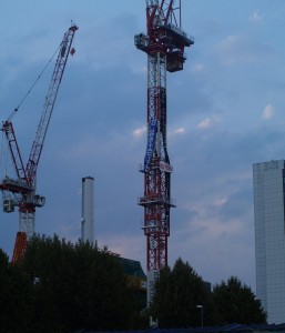 Quasi sospesi nel vuoto, stretti nelle piccole piattaforme tra le rampe della scala a pioli. E’ più emozionante che da quello che sarà un ufficio alto blindato dai vetri. Riunione a 55 metri dal suolo, dopo le prime intimazioni a scendere dai megafoni della polizia, dopo l’arrivo dei pompieri a sirene spiegate. Confermiamo di voler continuare l’occupazione della gru almeno fino alla fine del mattino di domenica, ora per la quale convochiamo un incontro-conferenza. Comincia una lunga e complessa notte che per motivi di spazio non posso raccontare tutta qui. Pizze negate, mamme, luci (leggi tutto il racconto su Paolohutter.eu). Ci premono con telefonate, mentre talvolta un pompiere, talvolta due salgono per convincerci a scendere. Salta fuori che è in programma proprio di domenica mattina una manutenzione eccezionale della gru.