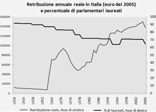 Il raffronto tra retribuzioni e tassi di istruzione è scioccante: le indennità parlamentari sono cresciute del 10% l’anno mentre la quota di laureati è scesa dello 0,5% annuo.