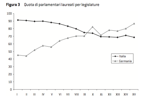 Più vecchi e tuttavia meno preparati. La percentuale dei nuovi eletti con una laurea è significativamente diminuita nel corso del tempo con un brusco crollo nel passaggio tra la prima e la seconda Repubblica: dal 91,4% nella I Legislatura, al 64,6% all’inizio della XV Legislatura. In pratica la casta è riuscita ad andare contro la tendenza nazionale che, negli stessi anni, ha visto aumentare sensibilmente la quota di popolazione istruita. Di questo passo, si arriverà al paradosso che il corpo degli eletti sarà meno istruito dei suoi stessi elettori.