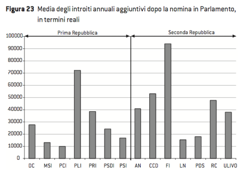 Entrare nel Parlamento Italiano conviene sempre: i redditi totali dei deputati nel primo anno di attività in Parlamento aumentano del 77% rispetto a quelli dell’anno precedente. Dal 1985 al 2004, in Italia il mestiere del Parlamentare è stato particolarmente redditizio. Infatti, il reddito reale annuale di un parlamentare è cresciuto tra 5 e 8 volte più del reddito reale annuale medio di un operaio, tra 3,8 e 6 volte quello di un impiegato, e tra 3 e 4 volte quello di un dirigente. Dalla fine degli anni 90’, il 25% dei parlamentari guadagna un reddito extraparlamentare annuale che e’ superiore al reddito della maggioranza dei dirigenti.