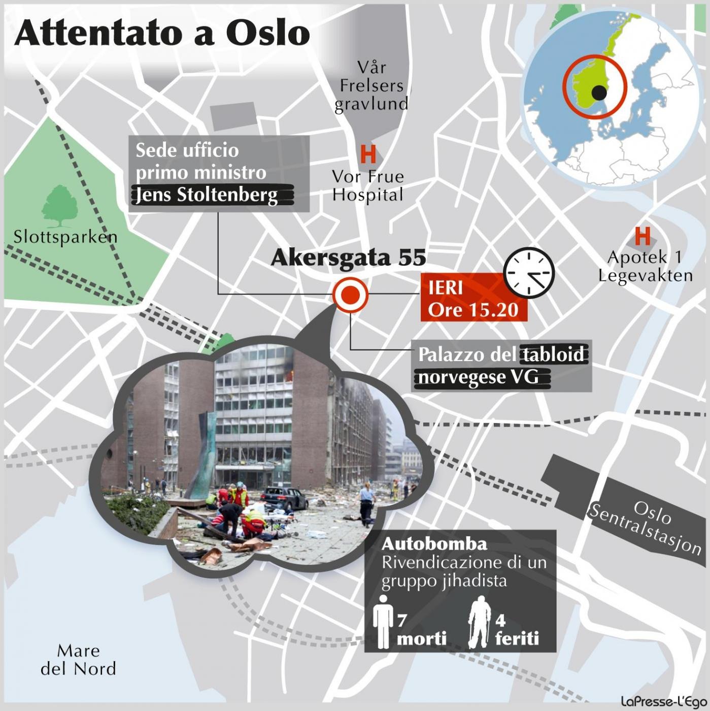 La Norvegia è sotto attacco. Dalle 13:20 Oslo si è trasformata in un inferno. Almeno una bomba e una sparatoria hanno causato un numero imprecisato di morti e feriti. Secondo gli investigatori ci sono elementi per affermare che i due attacchi sono collegati. Un’esplosione ha devastato il centro della capitale, investendo anche la sede del governo, e causando almeno sette morti e decine di feriti, tra cui almeno due gravi. Poco dopo, un uomo armato vestito da poliziotto ha raggiunto in barca l’isola di Utoya, a una trentina di chilometri dalla capitale, e ha aperto il fuoco in un campo estivo organizzato dall’Auf, l’ala giovanile del Partito Labourista. Lo sparatore è stato poi arrestato. La polizia lo ha collegato alla bomba scoppiata nel centro della città. In serata il Guardian riferisce il contenuto di un post pubblicato su twitter da un giornalista norvegese secondo il quale la polizia è convinta che gli attentati non siano di matrice terroristica internazionale