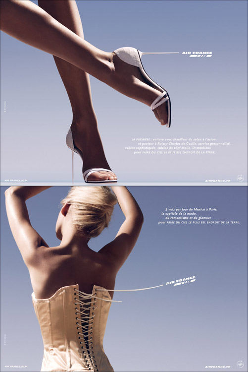 Ovviamente, possono esserci state discussioni ancora più complesse sul piano strategico. Comunque sia andata, il risultato finale è quello che conta: una campagna banale. Ma siccome siamo in un paese dove difficilmente si accettano le critiche che anzi vengono viste con sospetto perché “probabilmente celano interessi particolari”, oppure sono “di parte”, portiamo altri esempi. Vediamo come affronta lo stesso tema un’altra grande compagnia: Air France (guarda la campagna). La pagina si fa notare subito per l’eleganza del lay out. Poi c’è un tocco di classe proprio al centro dove cade l’occhio: un dettaglio nel vestiario della protagonista “punta” verso il marchio come se fosse l’ago di una bussola, a indicare una scelta spontanea, quasi inconscia, da parte del consumatore che pretende qualità nel servizio. L’impianto è di una essenzialità ed efficacia ben lontane dalla nostra pacchianeria nazionalpopolare. Lo slogan di marca riassume la mission : “Faire du ciel le plus bel endroit de la terre” (fare del cielo il più bel posto della terra). Come si conviene ad una grande compagnia che voglia comunicare qualità ed eccellenza. Ed Air France lo fa con splendida nonchalance. Già immaginiamo i commenti se una campagna del genere fosse stata presentata ad Alitalia: “Ma che roba è? Mica vendiamo scarpe e lingerie!”. E sarebbe stata scartata subito.