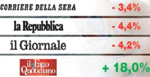 L’indagine, condotta dalla Ads (Accertamenti diffusione stampa), si riferisce al periodo maggio 2010-aprile 2011 confrontato con lo stesso periodo dell’anno precedente. I due principali quotidiani italiani, Corriere della Sera e Repubblica, perdono rispettivamente il 3,4 e il 4,4 per cento (490.350 copie di vendita media il primo e 445.822 il secondo). La Stampa di Torino registra una perdita del 6,3 per cento e non va meglio neanche al Sole 24 Ore (in campo economico Milano Finanza sale del 2,8 per cento) e al Messaggero di Roma, con cali del 3,5 e del 3,7 per cento. Batosta anche per Il Giornale e Libero. Il quotidiano di Alessandro Sallusti arretra del 4,2 per cento, mentre quello diretto da Maurizio Belpietro perde il 2,8 per cento. E mentre l’Unità (nel periodo preso in considerazione dall’indagine il giornale era ancora diretto da Concita De Gregorio) registra una perdita del 18,1 per cento, scendendo a 42.700 copie, il Fatto Quotidiano guadagna il 18 per cento, con una diffusione media di 68.869 copie. La Gazzetta dello Sport, invece, lascia sul terreno il 4,8 per cento.