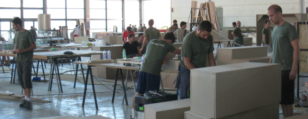 Al padiglione D7, un enorme cantiere di falegnameria lavora Luigi, brianzolo di 57 anni, in Cl da quando ne aveva 21. È dietro a un bancone e sulla sua testa campeggia un cartello con scritto a mano “La realtà è il corpo di Cristo”. Ora al meeting porta con sé anche i suoi due figli. Si distingue dagli altri per l’età e perché indossa una maglietta azzurra, quella dei capi, mentre gli altri volontari ce l’hanno verde. A casa Luigi si occupa di progettazione di impianti termici, al meeting dirige gli universitari, destreggiandosi tra progetti e metri cubi di legname. “I pannelli più grandi –dice- sono fatti da società esterne, noi volontari costruiamo circa 600 panche”. Viene da chiedersi a vedere tutto quel legno che fine faccia dopo il meeting. “Le panche – risponde Luigi- finito il meeting vengono buttate, costa troppo metterle a magazzino”.