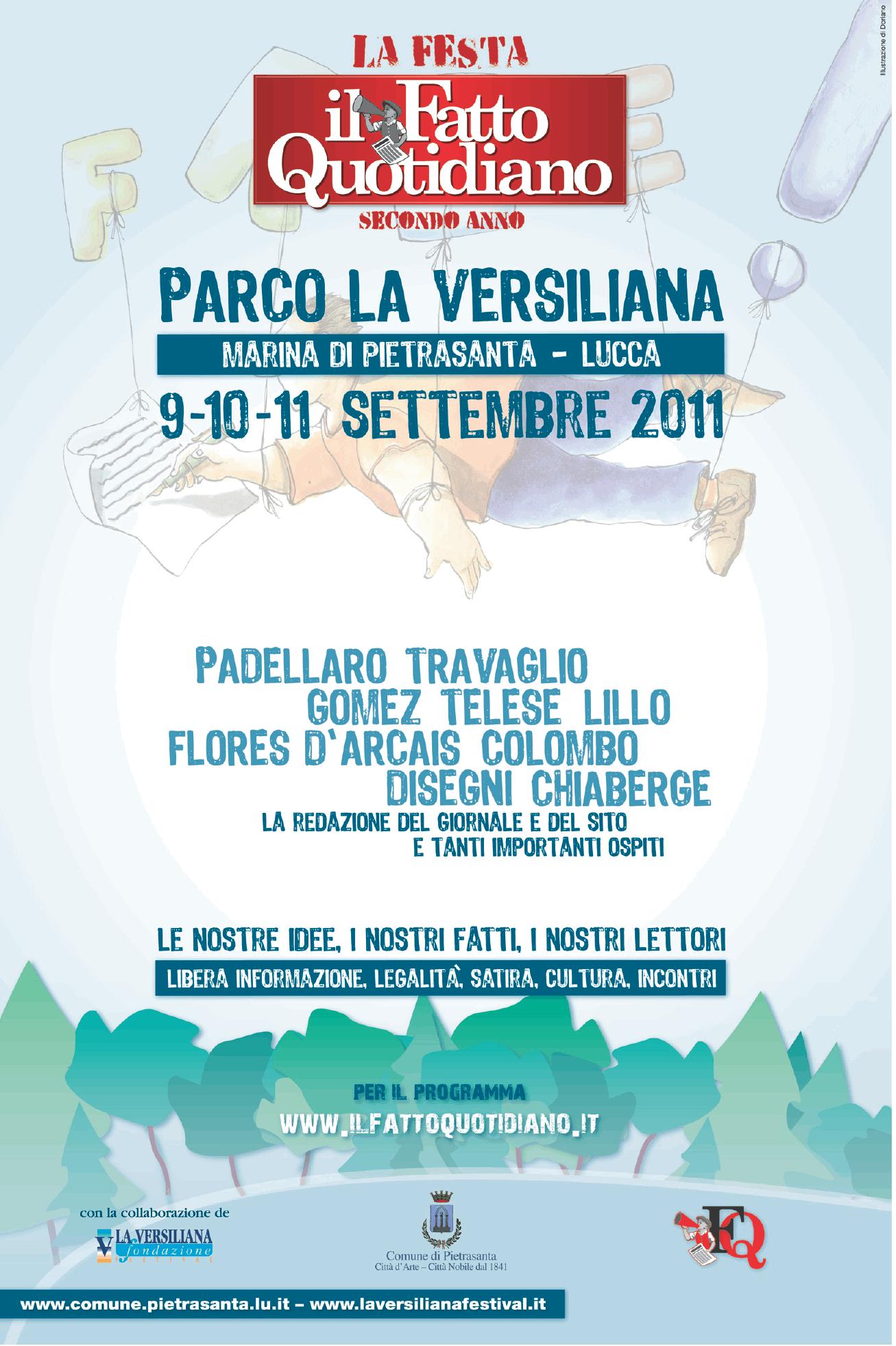 Conclusa la tre giorni di festa de Il Fatto Quotidiano a Marina di Pietrasanta (Lucca). A due anni dalla nascita (il 23 settembre 2009 uscì il primo numero) il quotidiano diretto da Antonio Padellaro (leggi l’articolo dedicato alla Festa), continua a voler creare momenti di incontro con i suoi lettori (Scarica il volantino). La partecipazione è stata non solo molto alta, ma anche affettuosa. Tutti gli eventi sono stati gratuiti e riguardabili sul sito fattoquotidiano.it dove è stato anche possibile seguire la diretta streaming dei dibattiti. Con la collaborazione de La Versiliana Fondazione Festival e il patrocinio del Comune di Pietrasanta, nella splendida cornice del Parco La Versiliana, giornalisti e blogger del Fatto si sono confrontano tra loro, con giornalisti di altre testate e rappresentanti del mondo della cultura. A condurre i dibattiti David Perluigi e Silvia Truzzi.