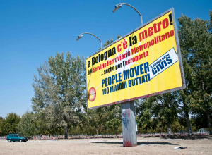 Chissà se rimarranno di soprassalto, se inarcheranno le sopracciglia e si faranno qualche domanda, oppure se tireranno dritto impassibili verso le lasagne del ristorante emiliano, la carne di quello argentino, o i microfoni del padiglione dei dibattiti. In ogni caso da oggi i frequentatori della festa dell’Unità di Bologna si troveranno davanti, su via Stalingrado, due enormi manifesti: costeggiano il viale e la rotonda di fronte all’ingresso della festa. Sei metri per tre, giallo fluorescente, le scritte rosse e blu: “People Mover 100 milioni buttati, il nuovo caso Civis”. E ancora, in primo piano: “A Bologna c’è la metro, è il servizio ferroviario metropolitano, anche per l’aeroporto”.