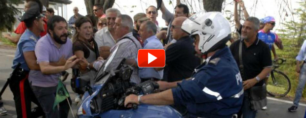 Elicotteri della Polizia che sorvolano in cerchi i punti “caldi” delle contestazioni. Camionette di Polizia e Carabinieri a presidiare ogni angolo della tappa e agenti infiltrati che cercano di sedare sul nascere le proteste. Salsomaggiore terme, meta della terza tappa del Giro di Padania, si è trasformato in un fortino per cercare di evitare- o, per lo meno, di circoscrivere- le manifestazioni di protesta che contraddistinguono ormai ogni tappa del tour ciclistico in salsa padana.