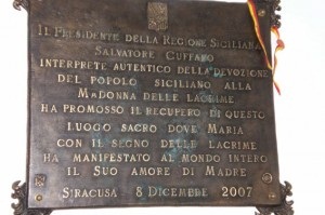 “Il presidente della Regione Sicilia Salvatore Cuffaro interprete autentico della devozione del popolo siciliano alla Madonna delle lacrime ha promosso il recupero di questo luogo sacro dove Maria con il segno delle lacrime ha manifestato al mondo intero il suo amore di Madre. Siracusa 8 dicembre 2007“. Così recita una targa bronzea posta a Siracusa, nella casa di via degli orti di San Giorgio, dove nel 1953 si è verificato il miracolo della lacrimazione della statuina della Madonna.