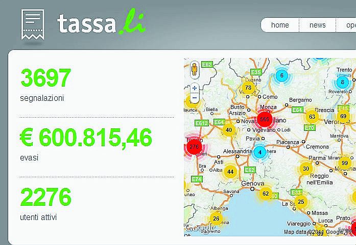 Il funzionamento è molto semplice: una volta scaricata l’app, quando nella vita di ogni giorno ci si trova a effettuare un acquisto senza che venga emesso lo scontrino o la ricevuta fiscale, basta prendere il proprio telefono, aprire Tassa.li e geolocalizzarsi indicando l’importo pagato e la “categoria” dell’attività che ha evaso le tasse (per esempio: “Bar” o “Meccanico”). Sul sito web, quindi, si va componendo una mappa dell’Italia dove sono segnate città per città, strada per strada, le infrazioni. Il sito si va popolando velocemente: le segnalazioni finora sono 3.733 per un totale di 608 mila euro evasi; naturalmente maggiori saranno gli utenti e più efficace sarà il servizio.