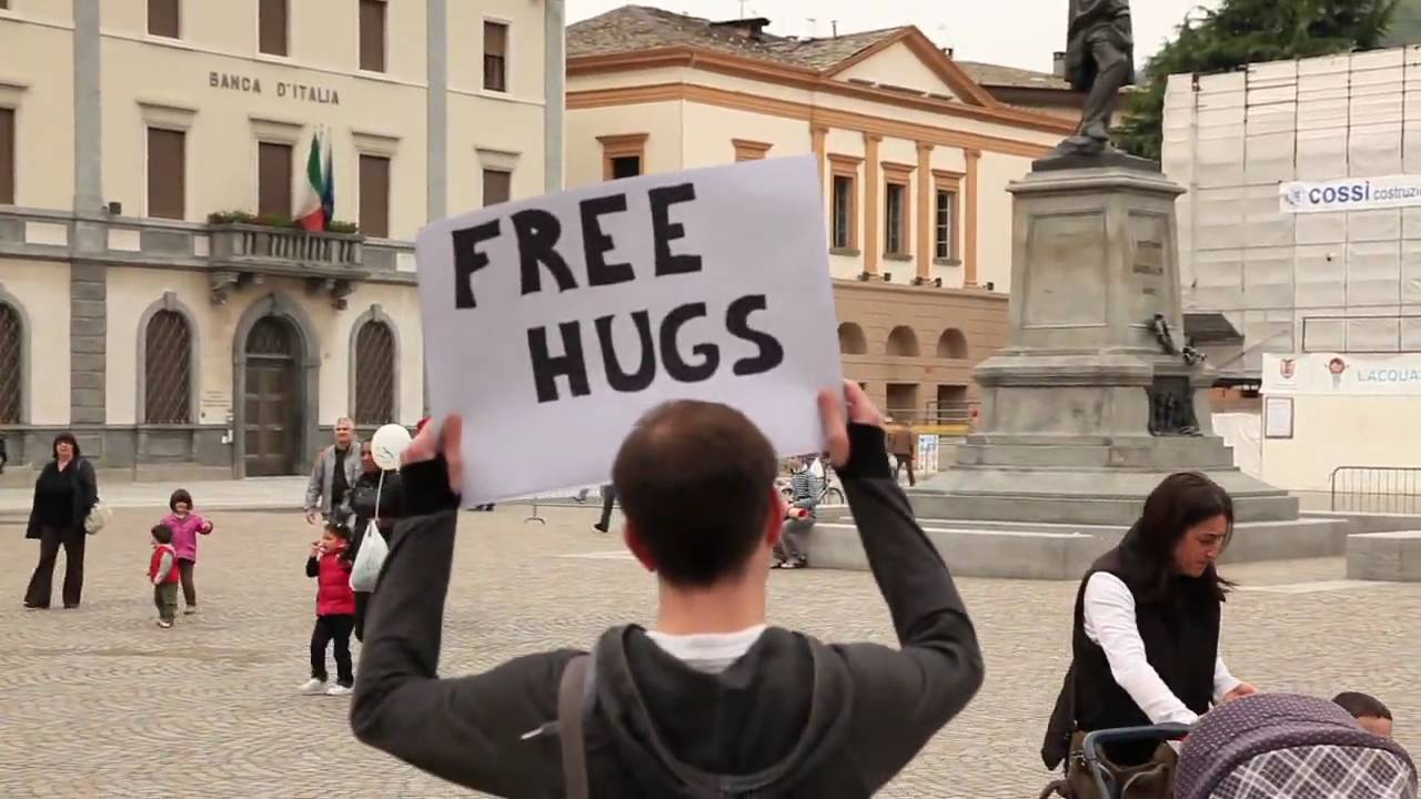 Due ragazzi, con una telecamera da 50 euro e un foglio di carta sono usciti per strada. Uno s’è appeso al collo la scritta “Abbracci gratis” e ha iniziato ad abbracciare i passanti mentre l’altro riprendeva. Hanno messo il video su You Tube che in pochi giorni ha superato il milione di download.