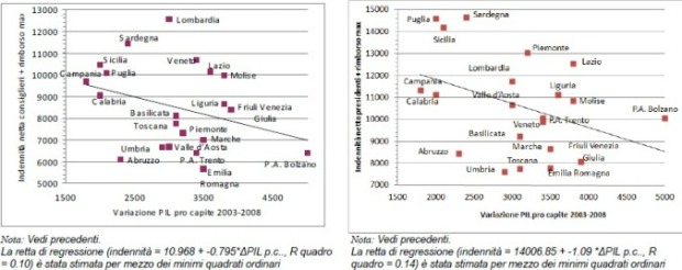 Nota: Indennità presidenti: indennità netta con esclusione dei rimborsi a pié di lista e dei rimborsi di cui alla lettera b dell’art. 52 del Tuir + massimo rimborsi di cui alla lettera b dell’art. 52 del Tuir Per le province autonome di Bolzano e Trento si prende in considerazione l’indennità del presidente della Regione Trentino Alto-Adige che ricoprono a turno i presidenti di Provincia. Pil pro capite 2008, fonte Eurostat.