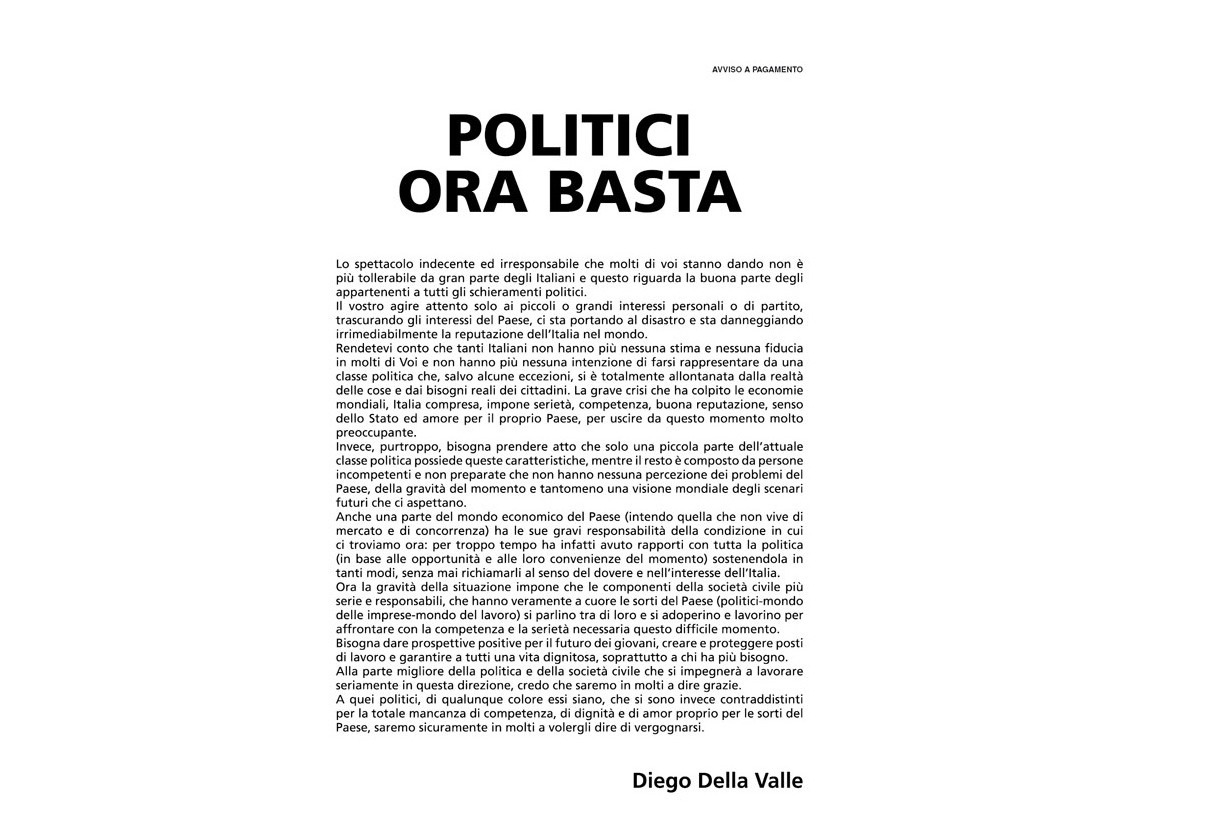 Dovevano essere destinate a pubblicizzare le scarpe Tod’s, invece le pagine comprate da Diego Della Valle sono state destinate a un altro scopo: sfogarsi e criticare l’attuale classe politica. Il j’accuse inizia così: “Lo spettacolo indecente che molti di voi stanno dando non è più tollerabile da gran parte degli italiani e questo riguarda tutti gli schieramenti politici”. “Il vostro agire attento solo agli interessi personali e di partito, trascurando quelli del paese, ci sta portando al disastro e sta danneggiando la reputazione dell’Italia”, prosegue l’imprenditore (leggi l’intera inserzione). Ad annunciare l’iniziativa è stato lo stesso Della Valle durante l’edizione serale di ieri del tg di La7.