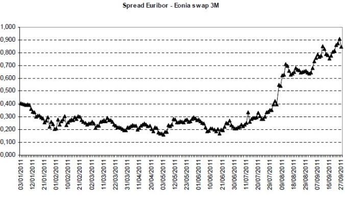 (1) Si tratta dello spread tra Euribor a tre mesi e Eonia swap sulla stessa scadenza: quest’ultimo misura le aspettative del mercato in relazione al tasso overnight per i prossimi tre mesi.
